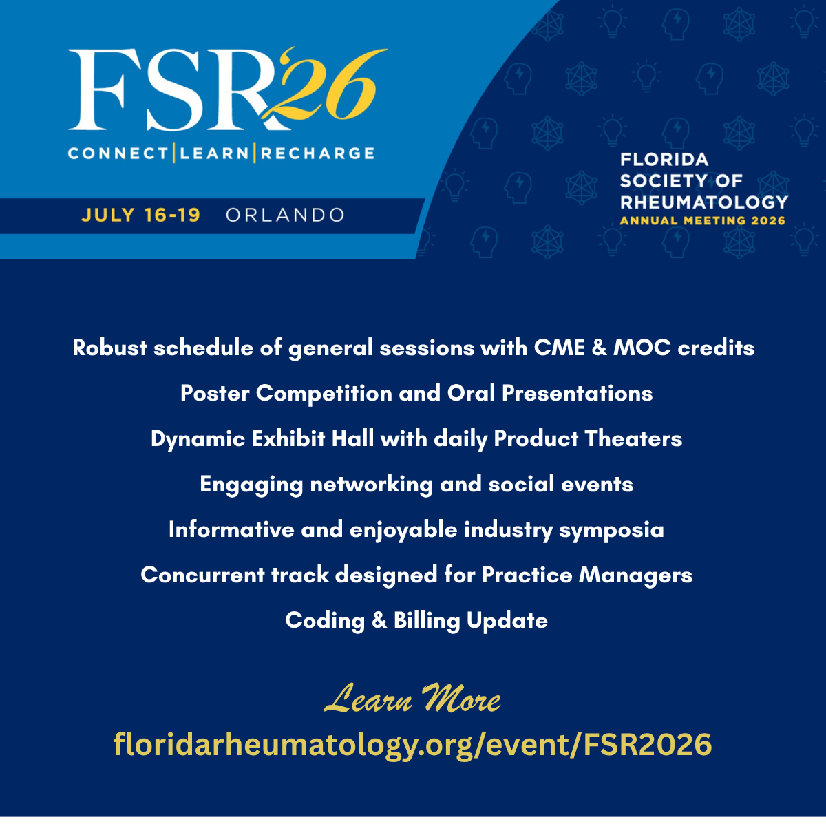 The Georgia Society of Rheumatology community is invited to join us for the Florida Society of Rheumatology 2026 Annual Meeting, taking place July 16–18, 2026, at Loews Sapphire Falls Resort. Connect with colleagues from across the Southeast while gaining valuable insights into the latest advancements in rheumatology. This year’s program features a robust schedule of educational sessions, along with opportunities to earn CME & MOC credits. We look forward to welcoming our Georgia colleagues for a collaborative and engaging experience. Learn more and register: https://floridarheumatology.org/event/FSR2026 |